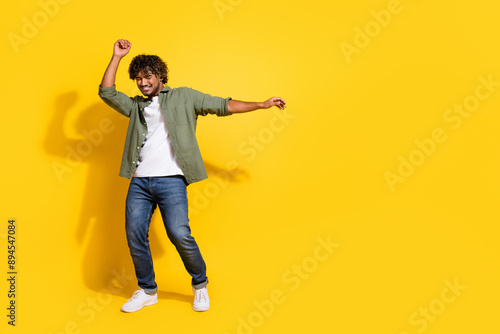 © deagreez, Fototapeta premium Portrait of young handsome carefree drunk student funny indian guy in khaki shirt dancing summer music vibes isolated on yellow color background
