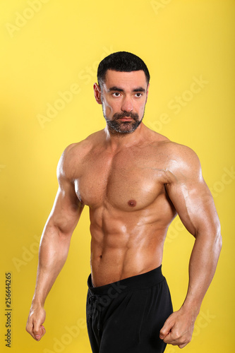 © Bas, Fototapeta premium Portrait of young handsome muscular bodybuilder on yellow background