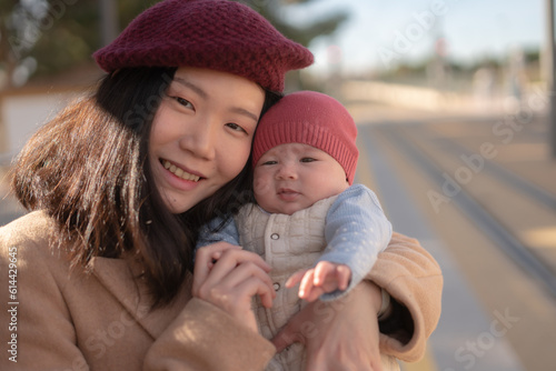 Obraz premium portrait of young happy and beautiful Asian Korean woman in stylish beret holding outdoors her sweet daughter , a cute and adorable 4 months old baby girl in mother and child love concept