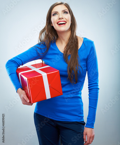 Fototapeta premium Portrait of young happy smiling woman hold red gift box. Isolat