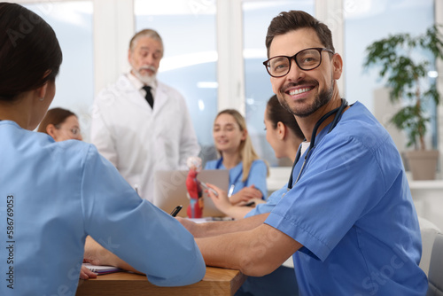 Fototapeta premium Portrait of young intern wearing uniform on lecture in university