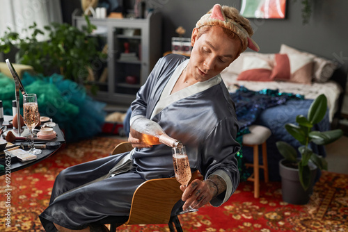 © Seventyfour, Naklejka premium Portrait of young male performer enjoying glass of champagne while doing makeup in hotel room, copy space