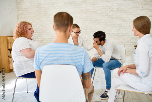Fototapeta premium Portrait of young man crying in support group sharing problems with female...