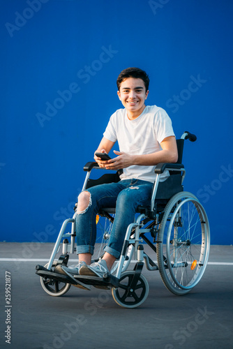 Obraz premium Portrait of young man on wheelchair using mobile phone