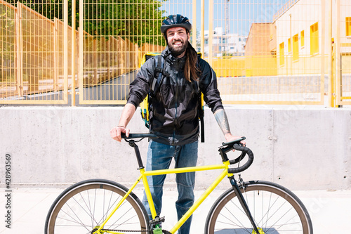 Fototapeta premium Portrait of young man who works delivering food by courier to home.