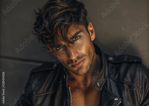 © Normal Desing, Fototapeta premium Portrait of young middle eastern man in leather jacket looking confidently outdoors urban setting fashion photography
