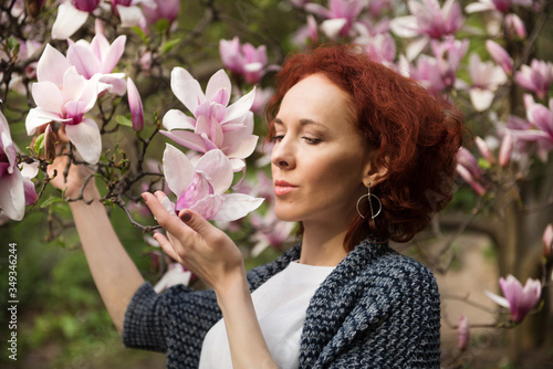 © Anastasia Rudenko, Fototapeta premium Portrait of young pretty red haired woman near blooming magnolia tree on sunny spring day