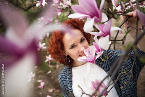 © Anastasia Rudenko, Fototapeta premium Portrait of young pretty red haired woman near blooming magnolia tree on sunny spring day