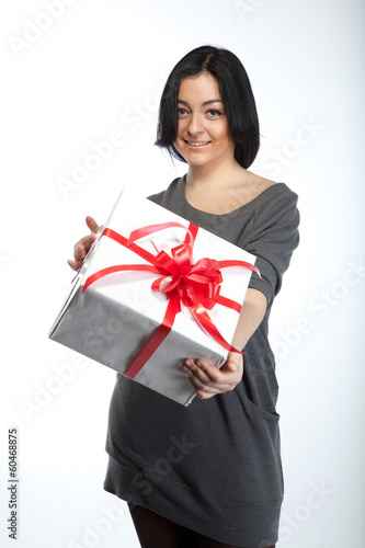 Fototapeta premium Portrait of young smiling woman with gift on white
