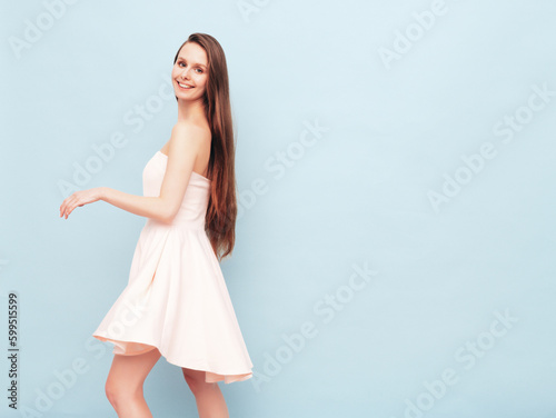 Naklejka premium Portrait of young winsome woman in romantic attire pretty smiling on blue background. Slim female in pure pink dress posing in studio. Cheerful model. Isolated. Long hair