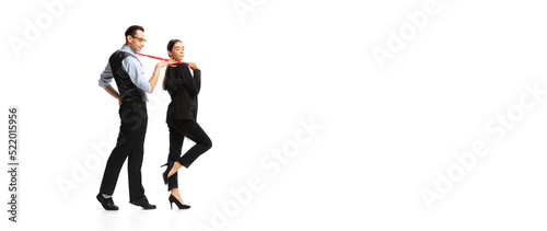 © Lustre Art Group , Fototapeta premium Portrait of young woman carrying man, employee on tie isolated on white background. Business control and following