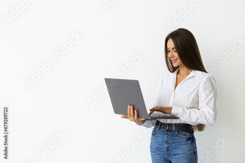 © F8 \ Suport Ukraine, Naklejka premium Portrait of young woman in casual outfit with laptop isolated on white background