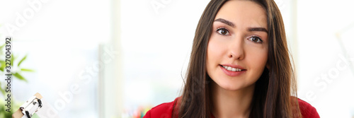 © megaflopp, Obraz premium Portrait of young woman in office presenting statistics and analytics report