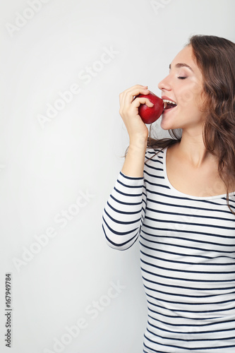 Fototapeta premium Portrait of young woman with apple on grey background