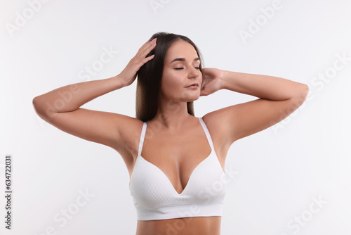 Fototapeta premium Portrait of young woman with beautiful breast on white background