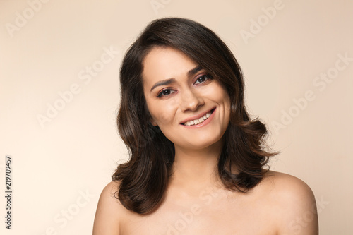 Obraz premium Portrait of young woman with beautiful makeup on color background. Professional cosmetics