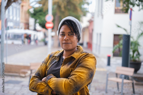 Fototapeta premium Portrait of young woman with dreadlocks and urban style type hat outdoors in...