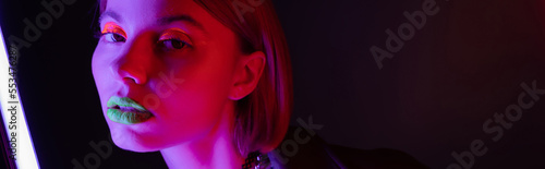 © LIGHTFIELD STUDIOS, Fototapeta premium portrait of young woman with neon makeup posing in purple light of neon lamp on black background, banner.