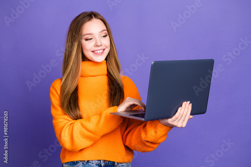 © deagreez, Naklejka premium Portrait photo of youth charming blonde hair cute happy smile girl in orange turtleneck studying online with laptop isolated on violet color background