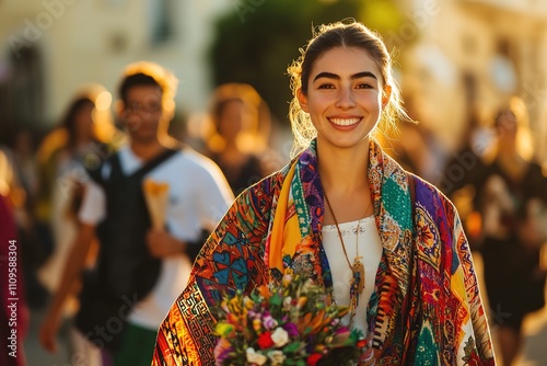 Obraz premium portrait photo people of cheerful woman with colorful scarf walking at front...
