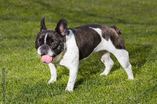 Fototapeta premium Portrait picture of a French Bulldog puppy who is playing in the yard on the...