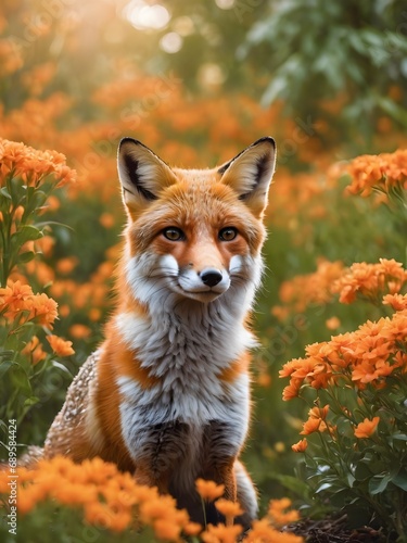 Naklejka premium portrait red fox in the flower jungle