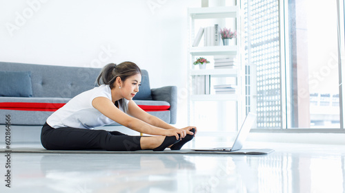 © Bangkok Click Studio, Obraz premium Portrait shot Asian beautiful healthy fit slim sexy female sporty athlete model in sportswear and leggings sitting stretching arms smiling look at camera ready for workout exercising via online video