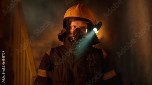 Fototapeta premium Portrait Shot of a Brave Fireman Standing in a Burning Building Fire Raging...