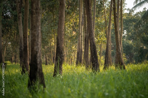 Obraz premium Portrait shot of scattered tree trunks surrounded by dense green grass