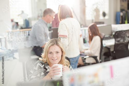 © KOTO, Fototapeta premium Portrait smiling fashion designer drinking coffee at computer in office