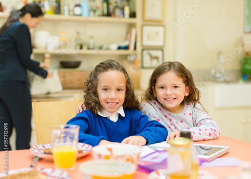 Fototapeta premium Portrait smiling sisters at breakfast table