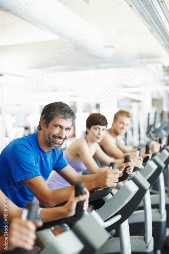 © STEEXBuyout/peopleimages.com, Obraz premium Portrait, spin class or happy man cycling in gym, training and exercise for group, health or fitness. Smile, mature or people riding bicycle machine for cardio, strong legs or power for body workout