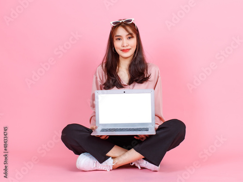 © Bangkok Click Studio, Naklejka premium Portrait studio shot of Asian young hipster female model in casual street wears sunglasses sit on floor holding pointing white blank empty screen laptop computer for advertising on pink background.