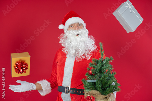 © Sarah, Naklejka premium Portrait von einem verkleideten Weihnachtsmann mit Geschenk und Weihnachtsbaum, isoliert auf roten Hintergrund im Studio