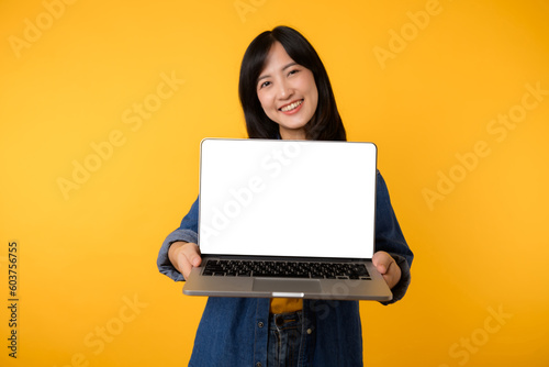 © Jirawatfoto, Naklejka premium portrait young happy woman wearing yellow t-shirt and denim shirt holding laptop and point finger to screen isolated on yellow studio background. business technology application communication concept.