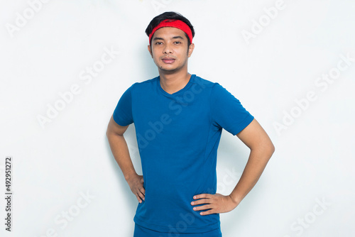 © dwi, Fototapeta premium portrait young sporty man dressed in blue tshirt on white background