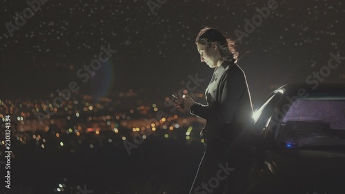 © petrushin1984, Fototapeta premium portrait young woman driver stands next to a car night lights of the city
