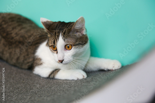 © Petr Smagin, Naklejka premium portret figlarny szary kot domowy z bliska