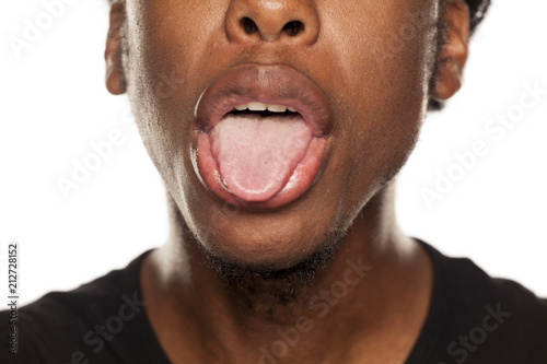 Naklejka premium Portret jęzor out zbliżenie młody czarny amerykanina afrykańskiego pochodzenia facet na białym tle