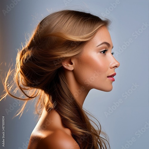 Obraz premium Portret kobiety z ciemnymi blond włosami na białym tle