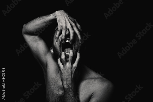 © Ruzanna, Obraz premium Portret mężczyzny w stylu horroru. Czarno-biały portret mężczyzny na czarnym tle. Mężczyzna otwiera szczękę dłońmi