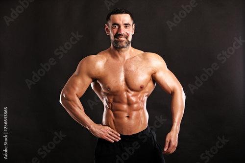 © Bas, Fototapeta premium Portret młodego przystojny mięśni kulturysta na czarnym tle