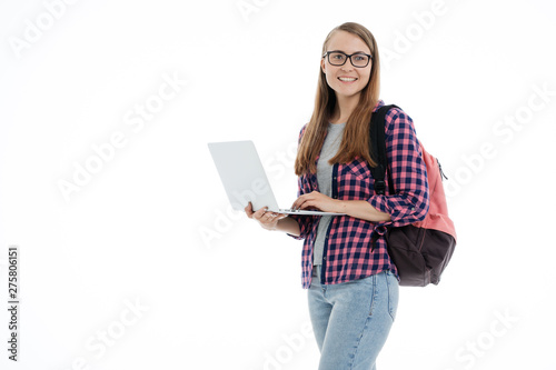 © Nastya_Gepp, Fototapeta premium Portret młodej dziewczyny smilling studenta na białym tle.