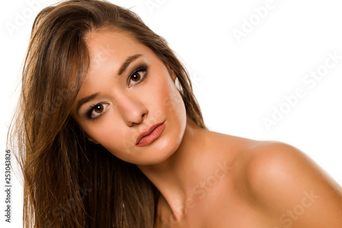 Fototapeta premium Portret młodej pięknej kobiety bez koszuli z makijażem na białym tle
