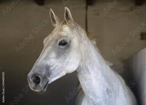 © acceptfoto, Obraz premium Portret pięknego konia pod siodłem w stodole