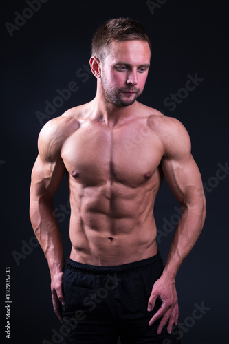 © Di Studio, Fototapeta premium portret przystojny, muskularny mężczyzna, shirtless, pozowanie na szaro