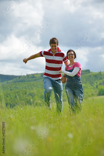 © .shock, Fototapeta premium Portret romantyczna młoda para ono uśmiecha się wpólnie plenerowy