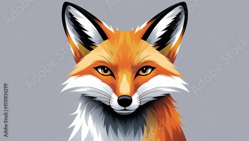 Naklejka premium Portret stylizowanego lisa z bliska. Pomarańczowo-czerwone futro, biało-szary spód, czarno-białe uszy. Intensywne, czujne oczy. Płaski, graficzny styl