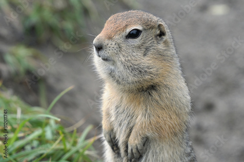© Alexander Piragis, Naklejka premium Portret wiewiórki arktycznej, uważnie rozglądającej się wokół, aby nie wpaść w paszczę drapieżnych bestii. Ciekawe dzikie zwierzę z rodzaju gryzonie z rodziny wiewiórek. Kamczatka, Rosja, Azja.