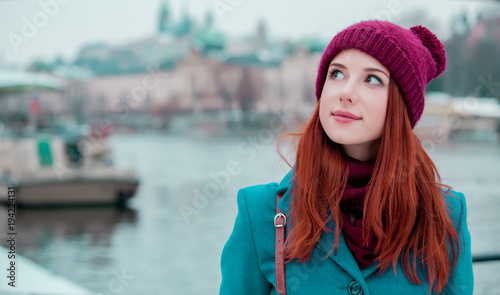 © Masson, Fototapeta premium Portriat młodej rudowłosej dziewczyny w kapeluszu i płaszczu w Pradze